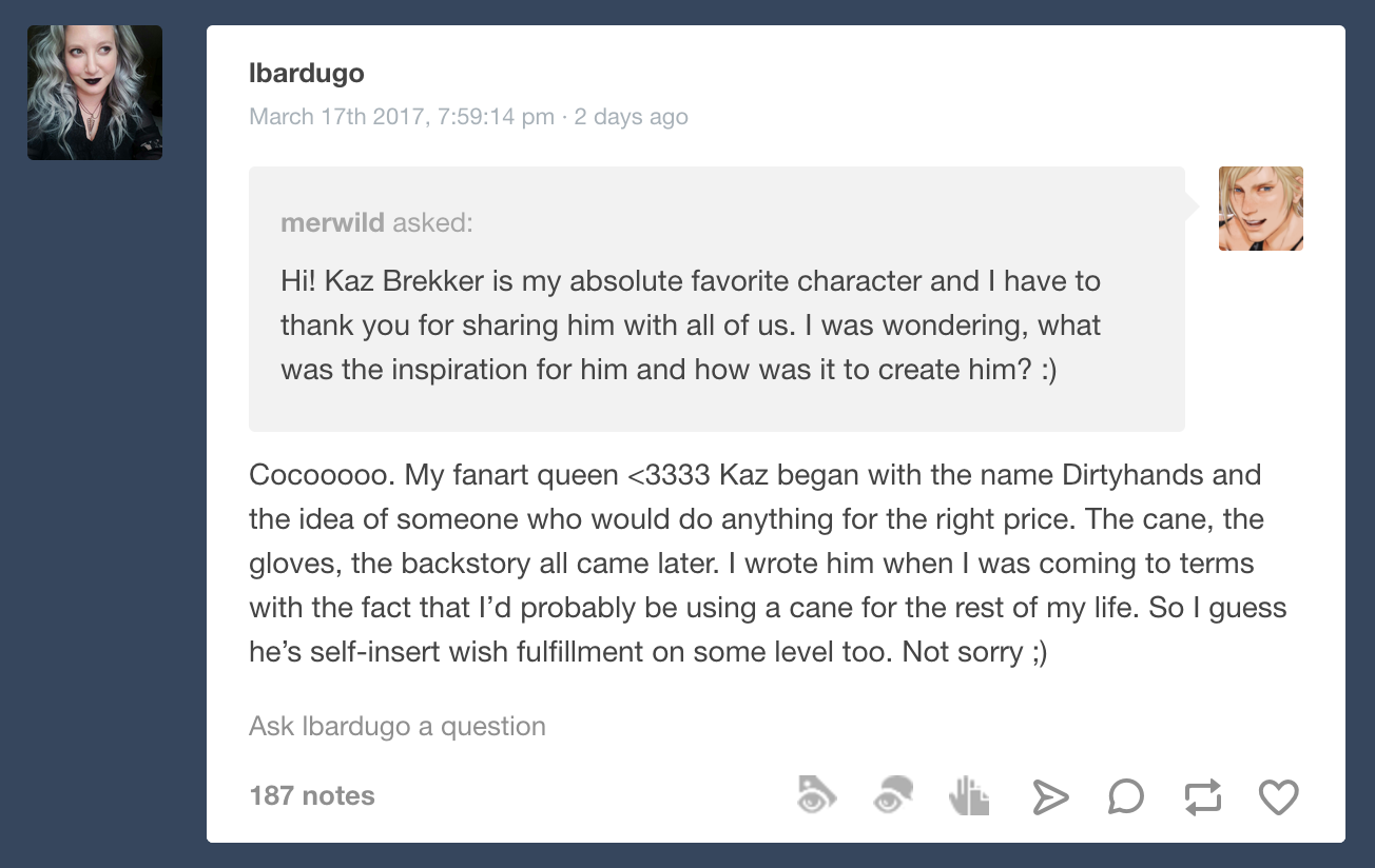 There really are endless cases of writer self-indulgence if you know where to look for them. Leigh Bardugo, author of The Grisha Trilogy, the Six of Crows duology, and the upcoming Wonder Woman: Warbringer, held an impromptu Q&A on her Tumblr where she revealed that she based her disabled character Kaz Brekker on her own experiences: